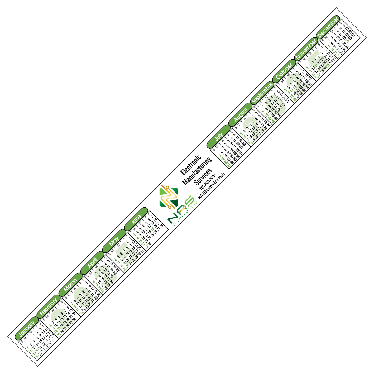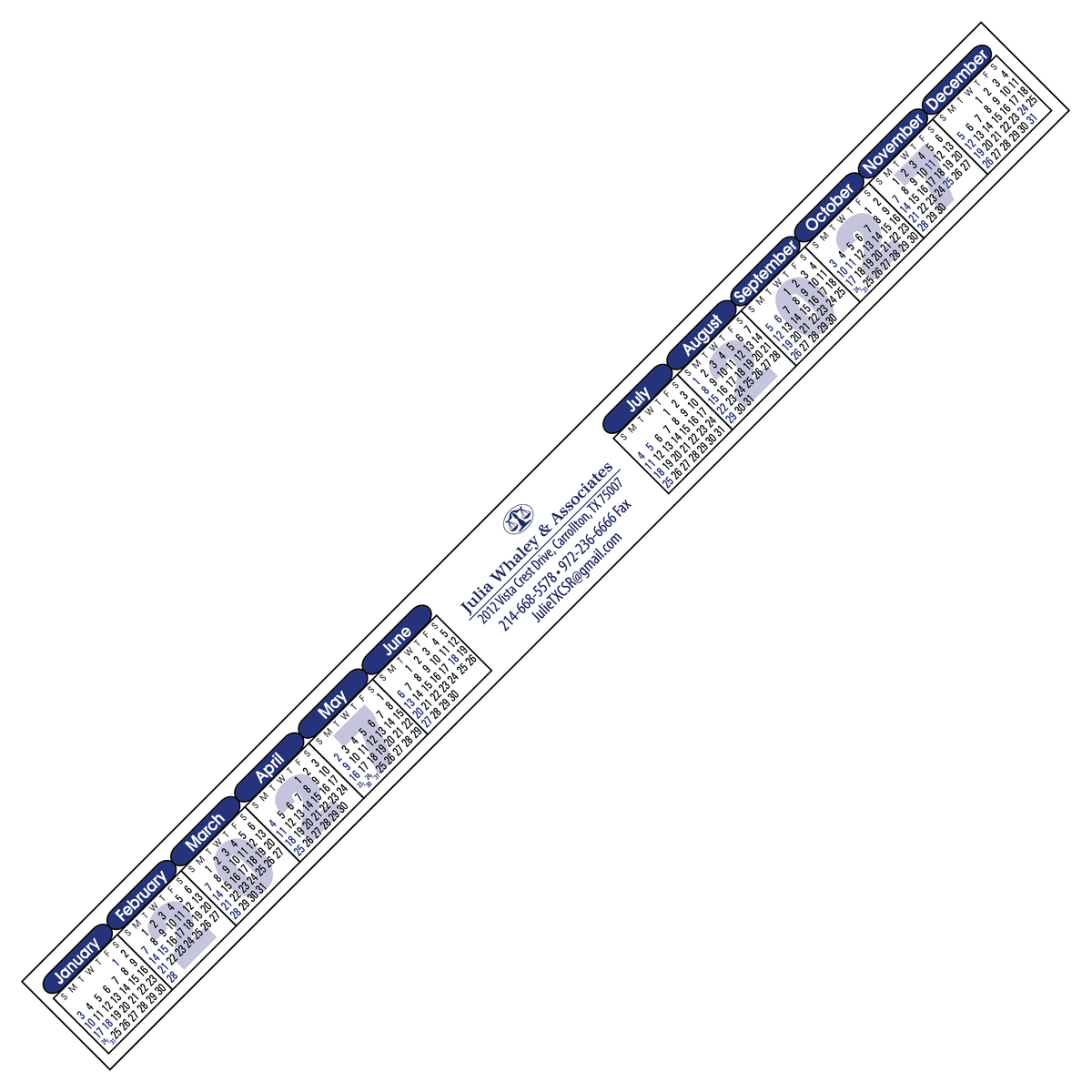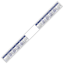 Don't strip your company of an outstanding promotional giveaway - order this full-color, Year-at-a glance strip calendar instead! Measuring 12 1/4" x 1 1/8", this black and blue calendar is made from quality vinyl with removable adhesive backing for easy repositioning. It is easy to read and features all 12 months of the year on one page. Customize with a brand imprint to create a must-have handout for any business, school or office.